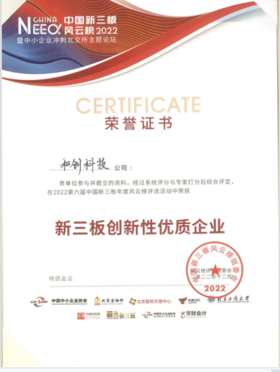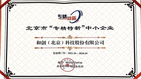2022.2和創(chuàng)科技憑借技術(shù)突破、產(chǎn)品創(chuàng)新、細(xì)分市場(chǎng)優(yōu)勢(shì)及拓展?jié)摿Φ榷喾矫鎯?yōu)勢(shì),榮獲北京市經(jīng)濟(jì)和信息化局2021年度第二批認(rèn)定的專精特新“小巨人”企業(yè)榮譽(yù)稱號(hào)。