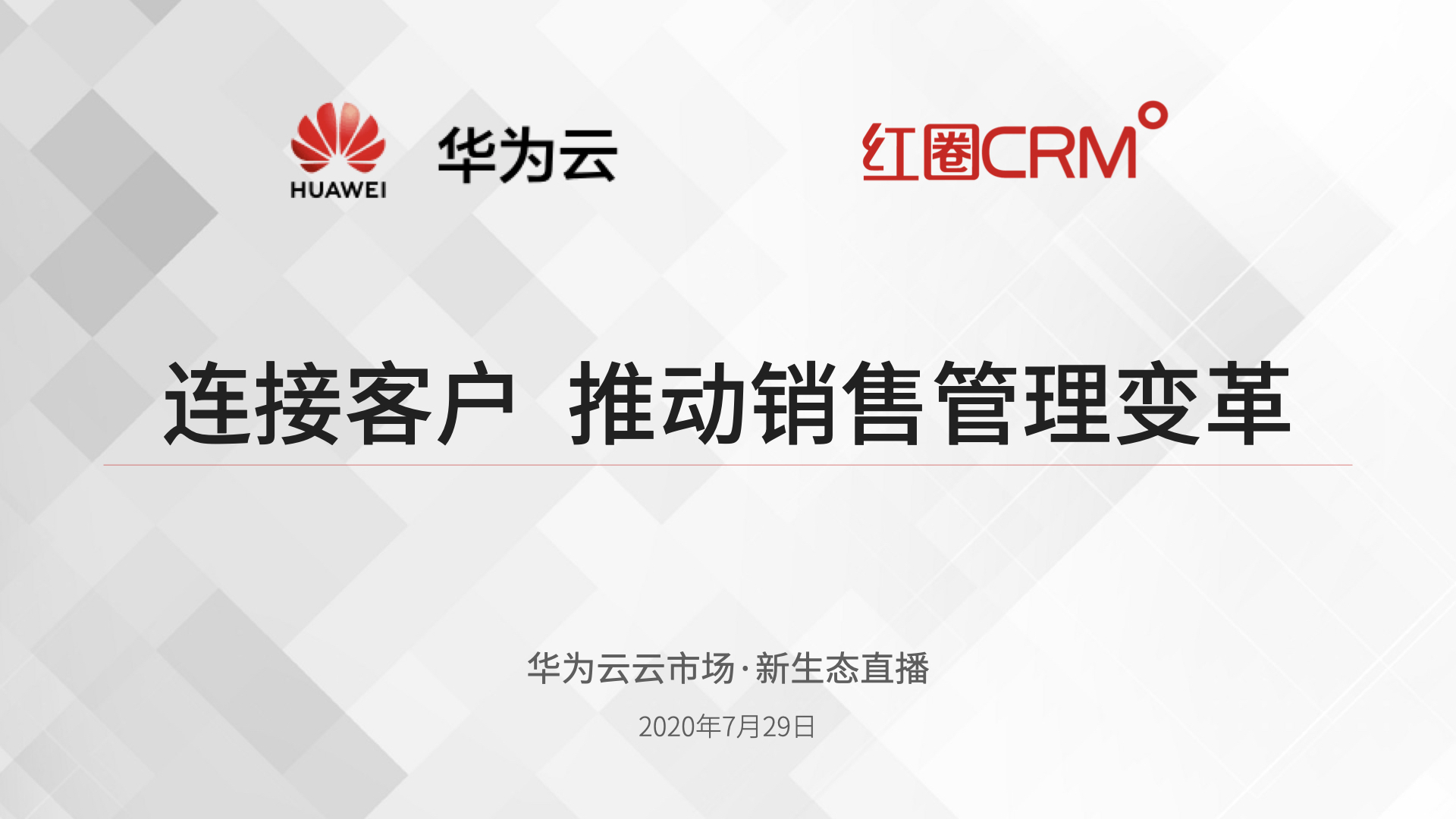 7月29日周三 15:00,紅圈聯合創始人兼 SVP 牛其建將在華為云云市場·新生態直播間為大家帶來一場精彩的主題分享——《連接客戶 推動銷售管理變革》,歡迎廣大朋友屆時前來觀看直播,一同探討企業數字智能轉型升級之道。